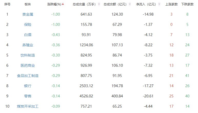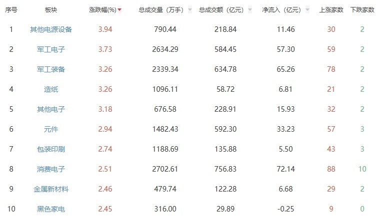 板块方面,其他电源成立、军工电子、军工装备等板块涨幅居前,贵金属、保障、白酒等板块跌幅居前。